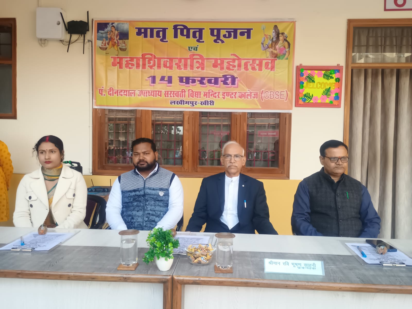 लखीमपुर। पंडित दीनदयाल उपाध्याय सरस्वती विद्या मंदिर इंटर कॉलेज (सीबीएसई) के प्रांगण में मातृ-पितृ पूजन एवं महाशिवरात्रि का पावन पर्व श्रद्धा, उत्साह और सांस्कृतिक गरिमा के साथ मनाया गया। कार्यक्रम का शुभारंभ मां शारदे के समक्ष पुष्पार्चन एवं दीप प्रज्ज्वलन के साथ हुआ, जिससे पूरा वातावरण भक्तिमय हो उठा।कार्यक्रम का सफल संचालन उप-प्रधानाचार्य संजय द्विवेदी जी की सुव्यवस्थित कार्ययोजना के अंतर्गत संपन्न हुआ। मंच संचालन का दायित्व आशीष बाजपेई जी ने कुशलतापूर्वक निभाया, जबकि अतिथियों का परिचय विद्यालय के प्रधानाचार्य अरविंद सिंह चौहान जी द्वारा कराया गया। इस अवसर पर मुख्य अतिथि के रूप में श्रीमती मंजू जायसवाल जी, विशिष्ट अतिथि सूरज जायसवाल जी, विद्यालय के कोषाध्यक्ष विमल अग्रवाल जी तथा प्रबंधक रवि भूषण साहनी जी की गरिमामयी उपस्थिति रही। अतिथियों ने विद्यालय द्वारा आयोजित इस सांस्कृतिक कार्यक्रम की सराहना करते हुए विद्यार्थियों के उज्ज्वल भविष्य की कामना की। अतिथि परिचय के उपरांत बहनों द्वारा मनमोहक सांस्कृतिक कार्यक्रम प्रस्तुत किए गए, जिनमें सुंदर गीत एवं नृत्य ने सभी का मन मोह लिया। भैयाओं द्वारा प्रस्तुत प्रेरणादायी गीत ने उपस्थित जनसमूह को भावविभोर कर दिया। कार्यक्रम में विद्यार्थियों की प्रतिभा और अनुशासन स्पष्ट रूप से झलक रहा था। विद्यालय के आचार्य कुलदीप शुक्ल जी ने अपने संबोधन में महाशिवरात्रि एवं मातृ-पितृ पूजन की सांस्कृतिक, आध्यात्मिक एवं सामाजिक उपयोगिता पर प्रकाश डालते हुए विद्यार्थियों को भारतीय संस्कारों के प्रति जागरूक एवं समर्पित रहने का संदेश दिया।