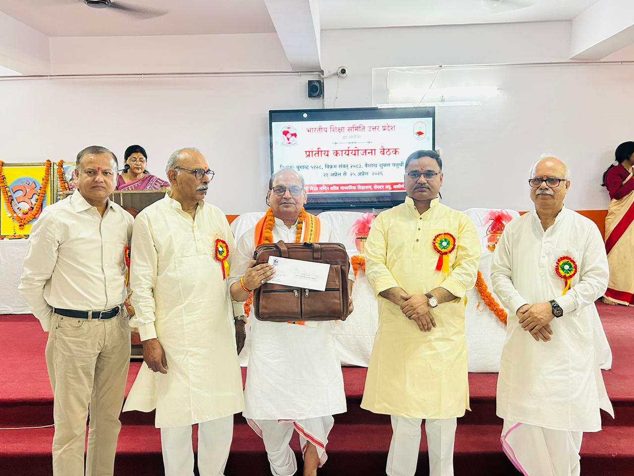 बैठक के दूसरे दिन वंदना सभा में भारतीय शिक्षा समिति के विद्यालयों में दीर्घकाल तक प्रधानाचार्य पद पर कार्यरत रहे एवं अवकाश प्राप्त प्रधानाचार्यों को सम्मानित किया गया। साथ ही वार्षिक पत्रिका “क्षितिज” का विमोचन क्षेत्रीय मंत्री डॉ. सौरभ मालवीय, अध्यक्ष श्री हरेंद्र श्रीवास्तव तथा सह मंत्री श्री अश्वनी मिश्र द्वारा किया गया। क्षेत्रीय मंत्री जी ने बताया कि प्रधानाचार्यों में श्रेष्ठ प्रशासक, प्रेरक, संरक्षक एवं नवाचारों को अपनाने के गुण होने चाहिए। विद्यालय विकास के साथ तकनीकी उन्नयन पर भी बल देना आवश्यक है। उन्होंने बताया कि विद्या भारती वर्ष 2027 की गुरु पूर्णिमा से अपनी 75 वर्षों की वैचारिक यात्रा का अमृत स्वर्णकाल मनाने जा रहा है।